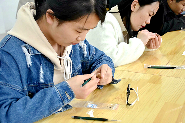 “人们对美的需求和创作想象产生了核雕”,希金老师先从审美需求开篇,引导同学们走进美学的境界。接下来,他从雕刻的基础刀法进行演示,教授核雕的入门手法:先雕出平面,再划线,线以细密齐为佳。为了激励同学学习核雕的积极性,老师首先传阅了他的核雕作品;虽然只是半成品,但是已经初具雏形,线条流畅优美,人物的开脸极好,给人一种美的感受。看到同学们都在跃跃欲试,刘老师安排分发雕刻工具制作工具和桃核,大家根据老师的要求,先练习基本功:将桃核推平然后划线。希金老师一边演示,一边轮流指导。同学们沉心静气,将桃核的棱角一点点推平,划线。虽然这个过程很枯燥,但万事开头难,想到以后自己能够雕刻出优秀的作品。同学们又有了动力。