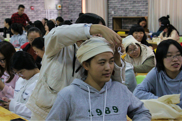 本次活动共分为两大环节。礼仪培训环节中,主持人以播放幻灯片、放映礼仪技巧短视频等方式,向同学们展示护士的基本礼仪姿态,包括“站、立、行、走”,与全体同学互动。同学们纷纷亲身体验,切身领会,强化了对所学内容的掌握。急救实践环节中,采取一对四的形式,一名志愿者负责为四位同学讲解并实践,使同学们通过实践来巩固所学的反折法、裹手法等包扎手法以及三角巾的使用,学生总结后互相分享学习收获,受益匪浅。