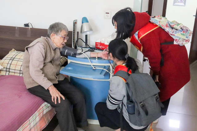 在颐年园,志愿者们在给老人们测量血压的同时与老人们沟通交流,了解日常情况,耐心回答老人们的疑惑,老人们对志愿者的服务表示肯定与感谢。