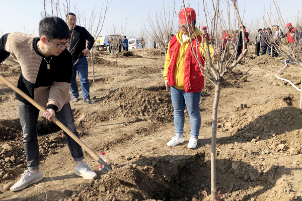 此次活动,生物科学与技术学院组建了一支30人的植树小队,在相关负责人的悉心安排下,同学们合理分工,齐心协力,有序地开展植树活动。植树现场,同学们挥舞铁锹埋沙土,扶植苗树列成行,呈现出一派激情四溢的劳动场面。