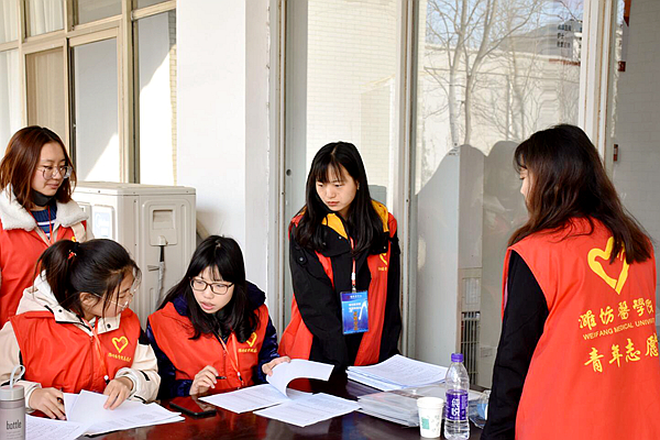3月23日,潍坊医学院2019年校园双选会正在浮烟山校区的如火如荼进行着,志愿服务“红马甲”和“蓝胸牌”们成为一道靓丽的校园风景线。