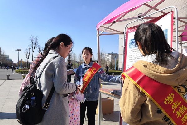 3月23日,学校毕业生春季校园双选会如火如荼进行。熙熙攘攘的人群中,一批身佩绶带的兰台人,精神抖擞,满腔热情,解惑答疑,递送宣传册。这是学生工作处学生档案管理科的大学生志愿者们正在为前来咨询的毕业生热情服务。