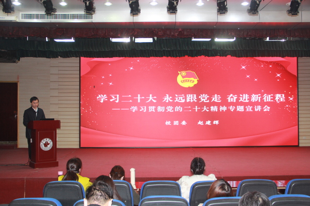团委书记赵建辉首先领学了党的二十大精神,作题为《学习二十大、永远跟党走、奋进新征程——深入学习贯彻党的二十大精神》主题团课,并就深入我校团学组织学习宣传贯彻好党的二十大精神提出要求。一是要充分认识学习宣传贯彻党的二十大精神的重大意义。党的二十大是在全党全国各族人民迈上全面建设社会主义现代化国家新征程、向第二个百年奋斗目标进军的关键时刻召开的一次十分重要的大会,是一次高举旗帜、凝聚力量、团结奋进的大会,在党和国家历史上具有重要里程碑意义。学习好、宣传好、贯彻好党的二十大精神,对于激励全校团员青年更加紧密地团结在以习近平同志为核心的党中央周围,奋力谱写学校高质量内涵发展的新篇章具有重大现实意义和深远意义。二是要深刻领会党的二十大精神实质,着力在掌握精神实质上下功夫、在学深悟透上下功夫、在融会贯通上下功夫。要深刻领会过去五年工作和新时代十年伟大变革,深刻领会“两个确立”的决定性意义,深刻领会习近平新时代中国特色社会主义思想开辟马克思主义中国化、时代化新境界的重大论断,深刻领会以中国式现代化推进中华民族伟大复兴的使命任务。党的二十大报告对青年一代寄予殷切期望,充分体现了习近平总书记一以贯之的关心关爱,广大青年要不断坚定“四个自信”,更好成长为堪当民族复兴大任的时代新人。三是要以学习宣传贯彻党的二十大精神为契机,全力抓好当前工作,全面贯彻党的二十大的实践要求。各级团组织要深刻领会精髓要义,带头在学习宣传贯彻党的二十大精神上走在前作表率,通过主题团日、座谈会等多种方式开展专题学习研讨,深入领会党的二十大报告、习近平总书记重要讲话背后所蕴含的立场观点方法和哲理学理道理。各级团干部要示范引领带动学,做到先学一步、学深一层,为广大团员青年作出示范、作出表率。广大团员青年要发扬理论联系实际的优良学风,把学习宣传贯彻党的二十大精神与深入贯彻习近平总书记关于青年工作的重要思想紧密结合起来,带着思考、带着问题、带着感情深学细研笃行,真正学出坚定信念、学出绝对忠诚、学出使命担当,做到学以致用、善始善终、善作善成。